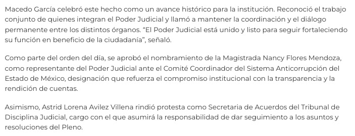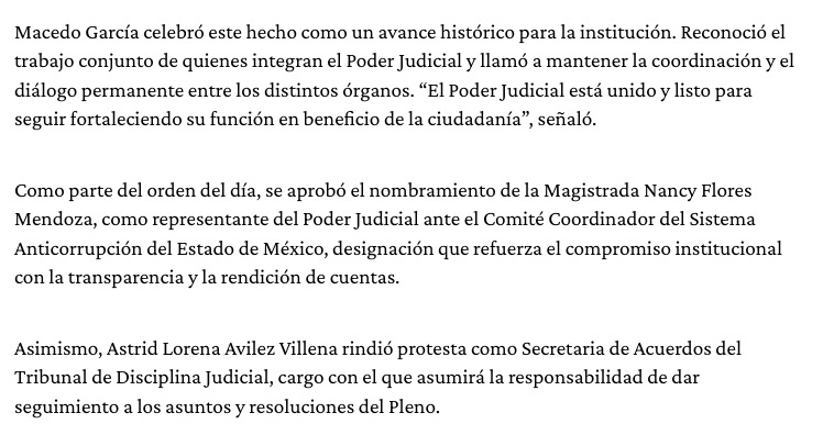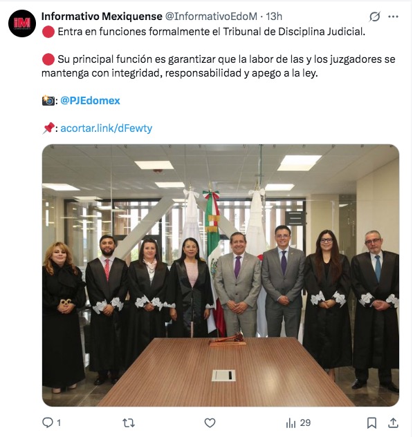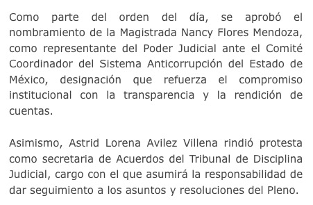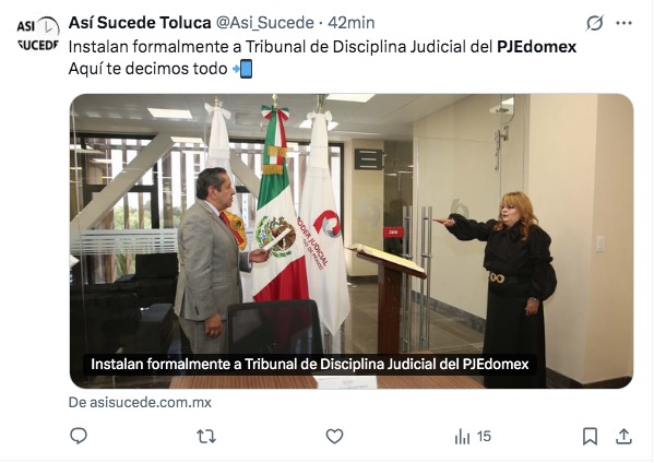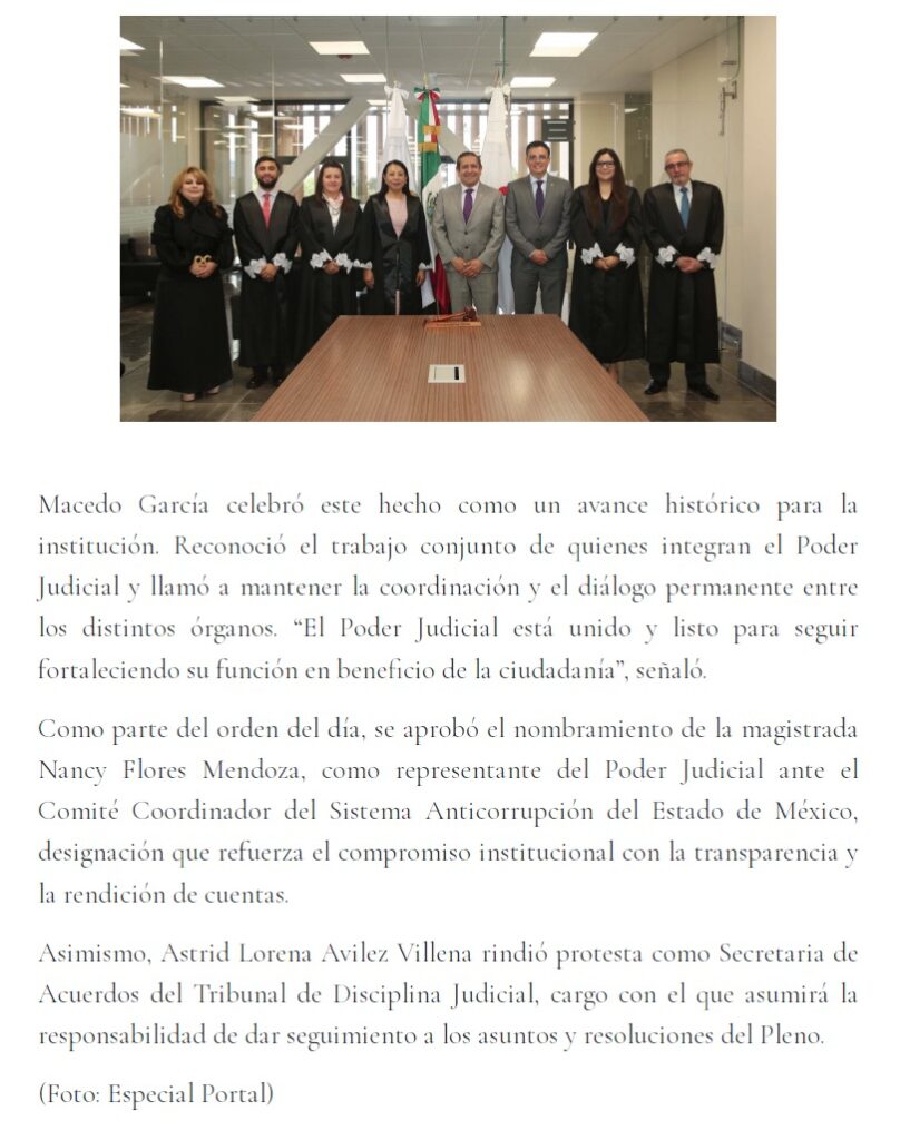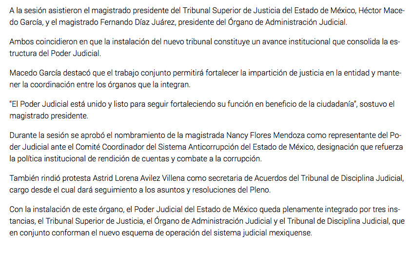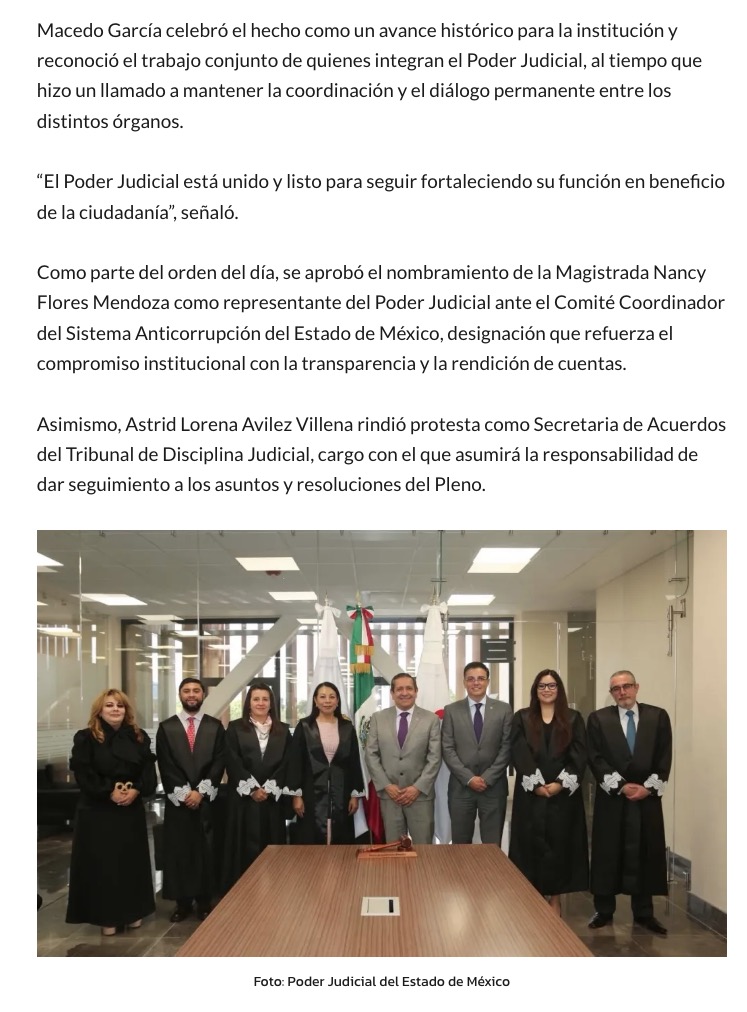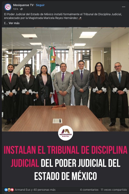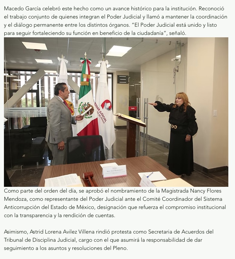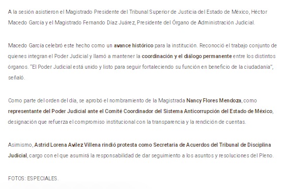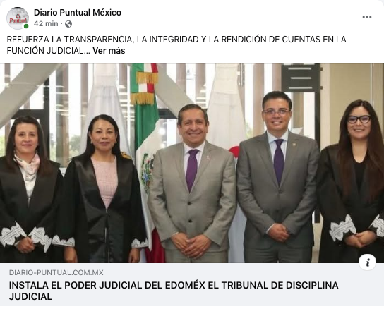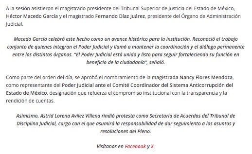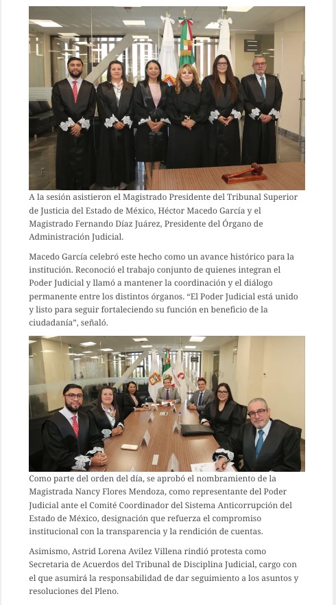 - https://www.planamayor.com.mx/instalan-formalmente-a-tribunal-de-disciplina-judicial-del-edomex/?fbclid=IwY2xjawNR7nZleHRuA2FlbQIxMQBicmlkETFKWkp1UzV2VkNOa2FNR282AR5377VUeoyZrmVfIlGcDYNMwxa0A1YU0nbdGEFt3cuHnl3_Sjgeeho2K6BaNg_aem_MzAoz_0fEbfZu3AvwR5ukw