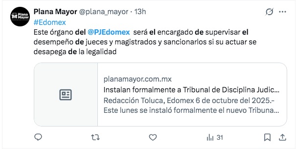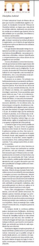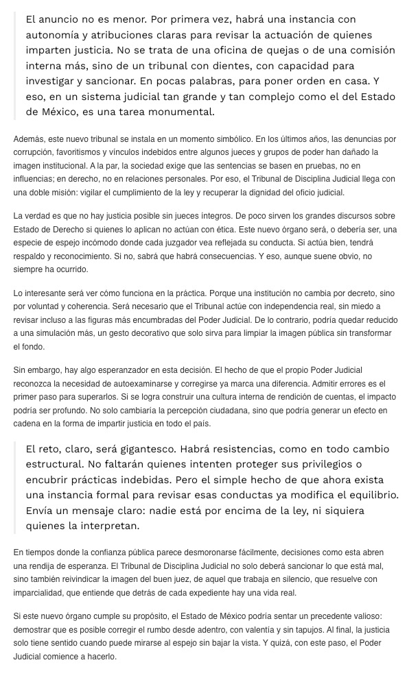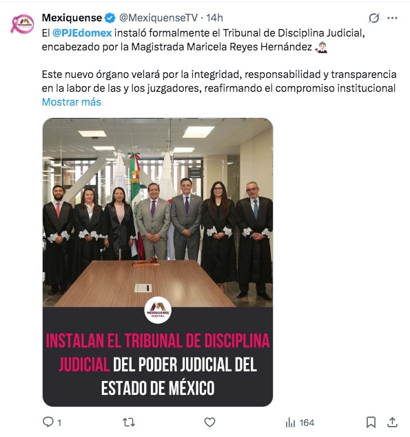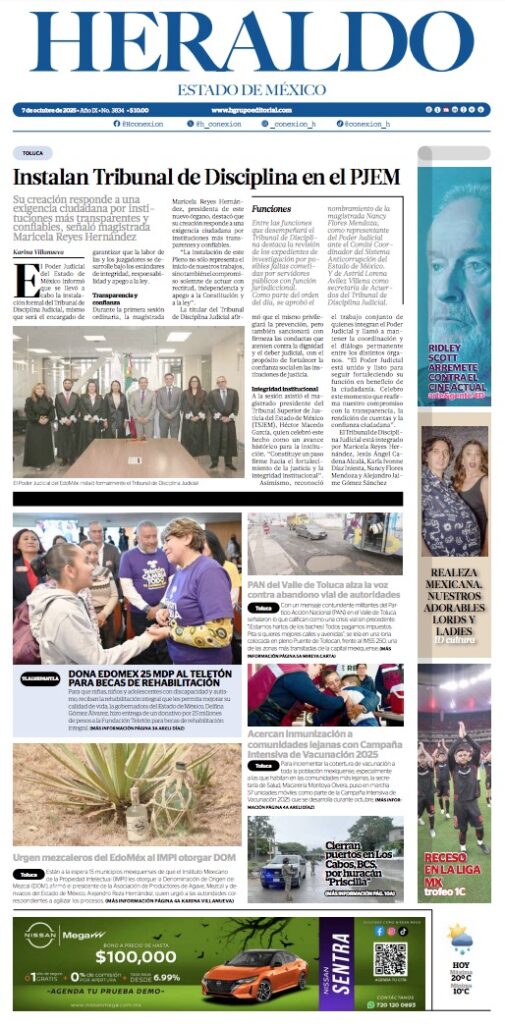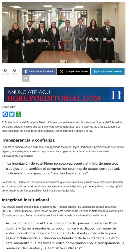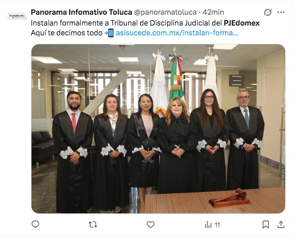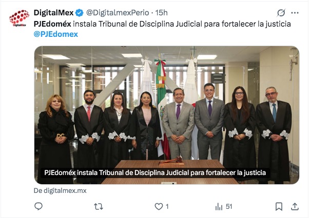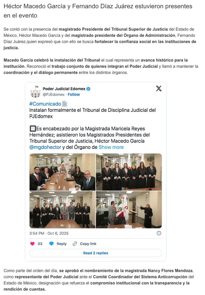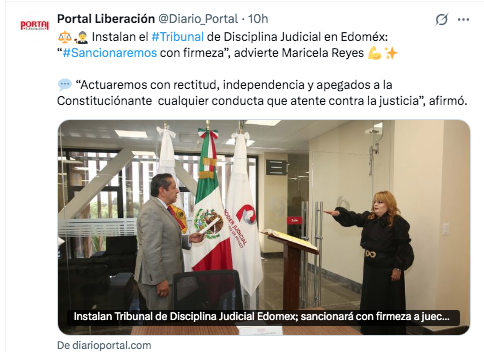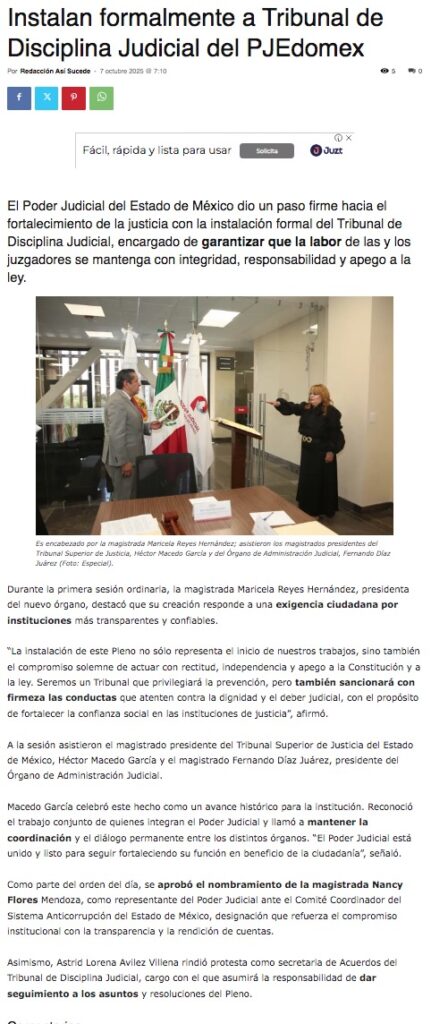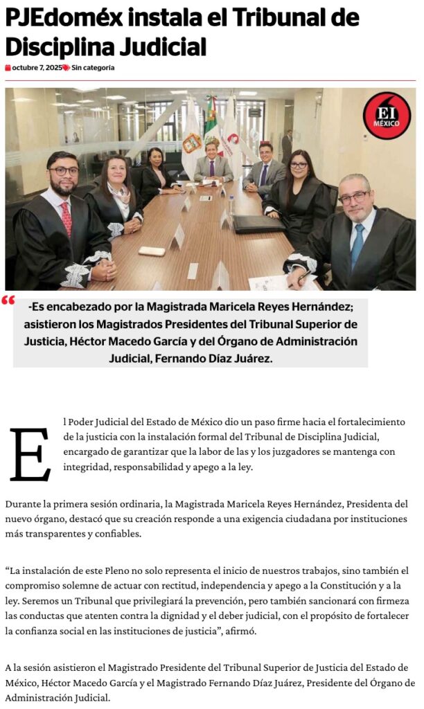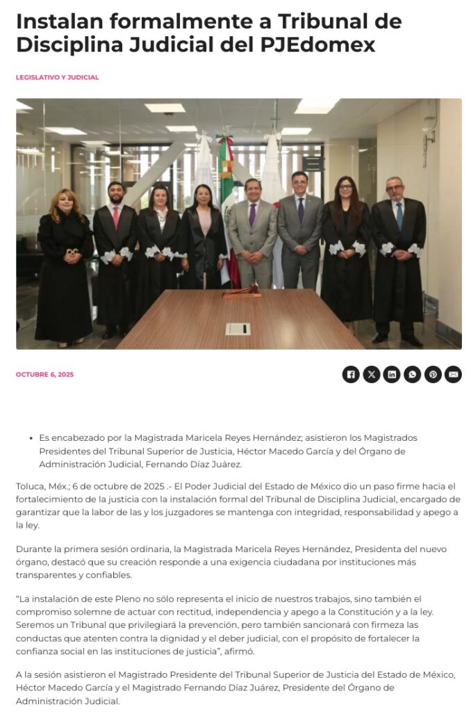 - https://www.xponencial.mx/2025/10/06/instalan-formalmente-a-tribunal-de-disciplina-judicial-del-pjedomex/?fbclid=IwY2xjawNR8HpleHRuA2FlbQIxMQBicmlkETFKWkp1UzV2VkNOa2FNR282AR6Gkmi8BOPG1OL2nME8FmLA-GIL5nRu2A_qluWv3lg9QPl1dlgUxvpNF2fEpw_aem_OsYe7I27fVrwxzCd9AtQmw