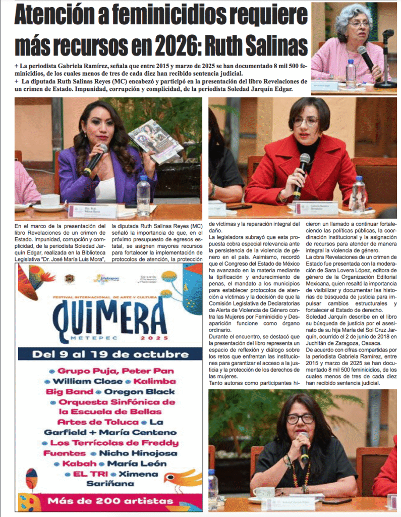 En el marco de la presentación del libro Revelaciones de un crimen de Estado. Impunidad, corrupción y complicidad, de la periodista Soledad Jarquín Edgar, realizada en la Biblioteca Legislativa “Dr. José María Luis Mora”, la diputada Ruth Salinas Reyes (MC) señaló la importancia de que, en el próximo presupuesto de egresos estatal, se asignen mayores recursos para fortalecer la implementación de protocolos de atención, la protección de víctimas y la reparación integral del daño.