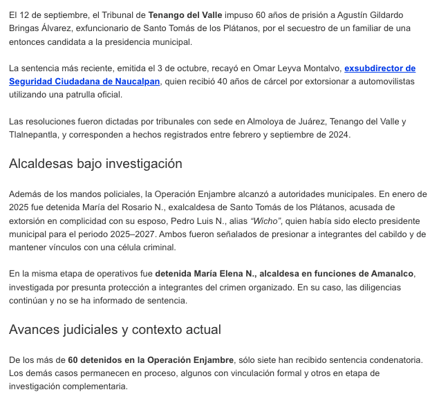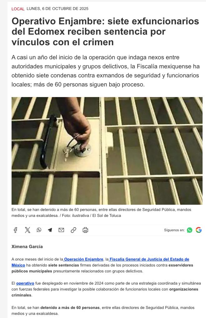 A once meses del inicio de la Operación Enjambre, la Fiscalía General de Justicia del Estado de México ha obtenido siete sentencias firmes derivadas de los procesos iniciados contra exservidores públicos municipales presuntamente relacionados con grupos delictivos.