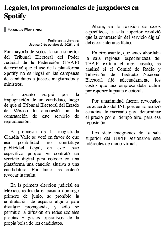 Por mayoría de votos, la sala superior del Tribunal Electoral del Poder Judicial de la Federación (TEPJF) determinó que el uso de la plataforma Spotify no es ilegal en las campañas de candidatos a jueces, magistrados y ministros.