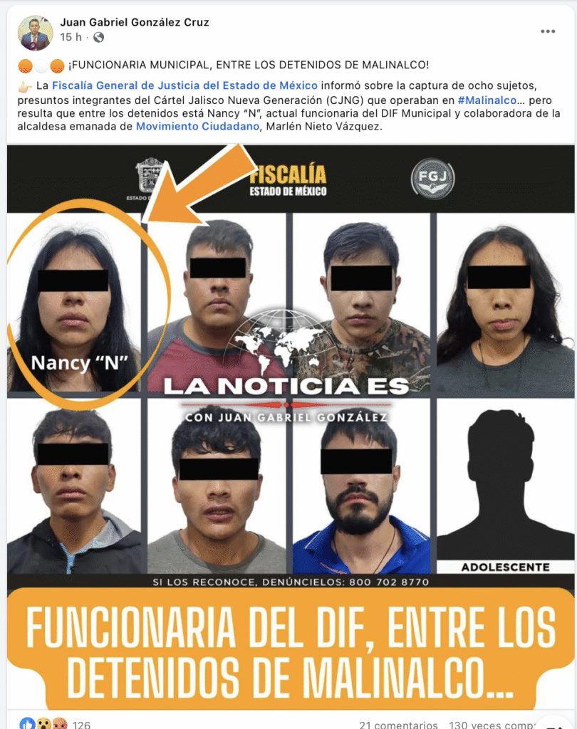 La Fiscalía General de Justicia del Estado de México informó sobre la captura de ocho sujetos, presuntos integrantes del Cártel Jalisco Nueva Generación (CJNG) que operaban en Malinalco… pero resulta que entre los detenidos está Nancy “N”, actual funcionaria del DIF Municipal y colaboradora de la alcaldesa emanada de Movimiento Ciudadano, Marlén Nieto Vázquez.