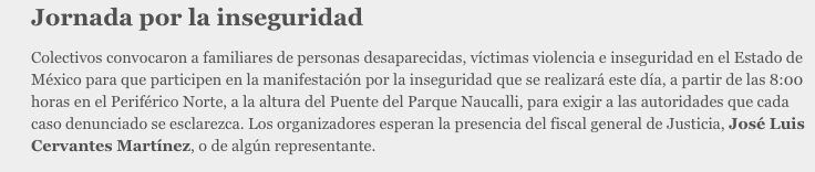 Colectivos convocaron a familiares de personas desaparecidas, víctimas violencia e inseguridad en el Estado de México para que participen en la manifestación por la inseguridad que se realizará este día, a partir de las 8:00 horas en el Periférico Norte, a la altura del Puente del Parque Naucalli, para exigir a las autoridades que cada caso denunciado se esclarezca. Los organizadores esperan la presencia del fiscal general de Justicia, José Luis Cervantes Martínez, o de algún representante.