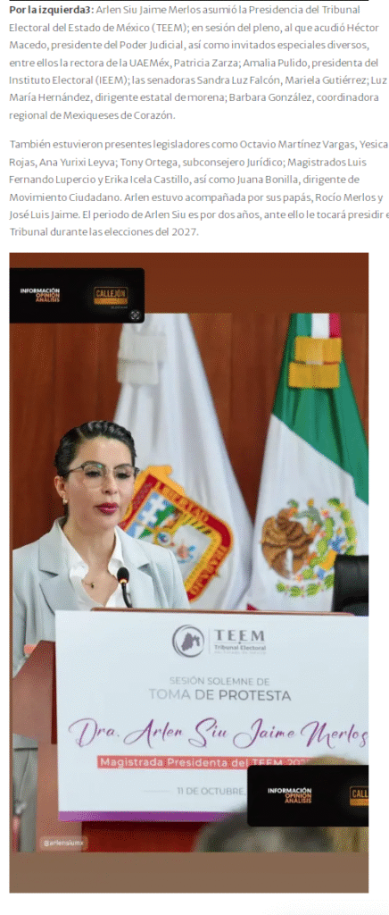 Arlen Siu Jaime Merlos asumió la Presidencia del Tribunal Electoral del Estado de México (TEEM); en sesión del pleno, al que acudió Héctor Macedo, presidente del Poder Judicial, así como invitados especiales diversos, entre ellos la rectora de la UAEMéx, Patricia Zarza; Amalia Pulido, presidenta del Instituto Electoral (IEEM); las senadoras Sandra Luz Falcón, Mariela Gutiérrez; Luz María Hernández, dirigente estatal de morena; Barbara González, coordinadora regional de Mexiqueses de Corazón.