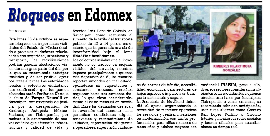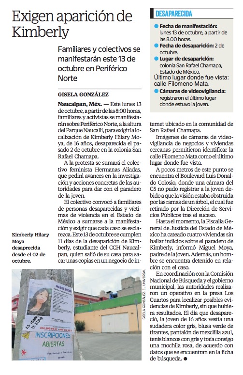 Este lunes 13 de octubre, a partir de las 8:00 horas, familiares y activistas se manifestarán sobre Periférico Norte, a la altura del Parque Naucalli, para exigir la localización de Kimberly Hilary Moya, de 16 años, desaparecida el pasado 2 de octubre en la colonia San Rafael Chamapa.