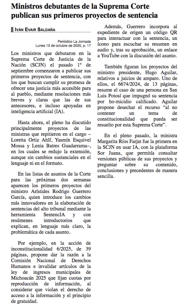 Los ministros que debutaron en la Suprema Corte de Justicia de la Nación (SCJN) el pasado 1º de septiembre comenzaron a publicar sus primeros proyectos de sentencia, con los que buscan cumplir su promesa de ofrecer una justicia más accesible para al pueblo, mediante resoluciones más breves y claras que las de sus antecesores, e incluso apoyadas en inteligencia artificial (IA).