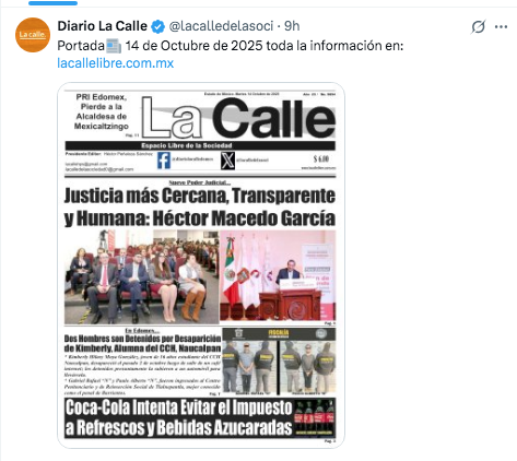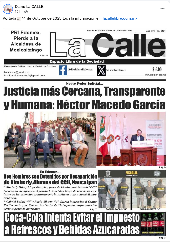 - https://www.facebook.com/diariolacalledomex/posts/pfbid0SMBMdfPfnJE5D4pqQPDijPLeRqUEtJHLvg6JqEx7X5USFGUuGnWUkPGcaEB8VmgUl