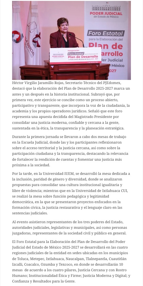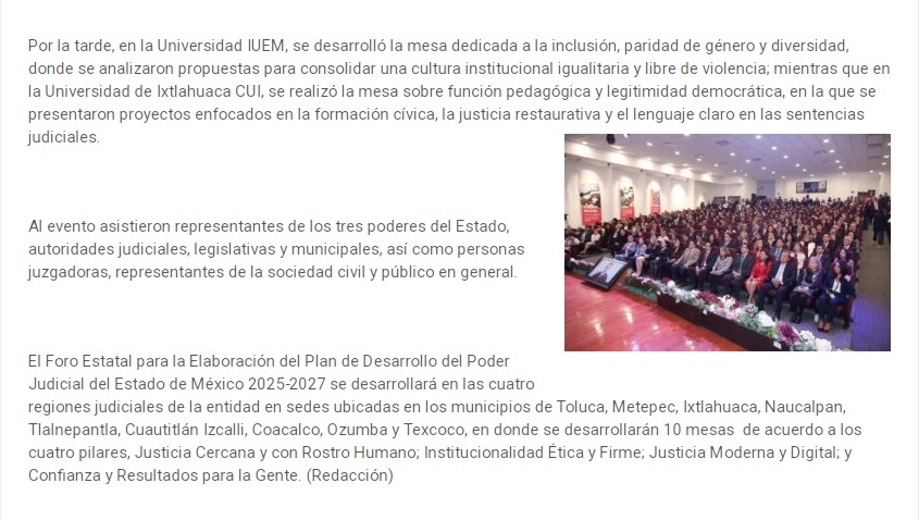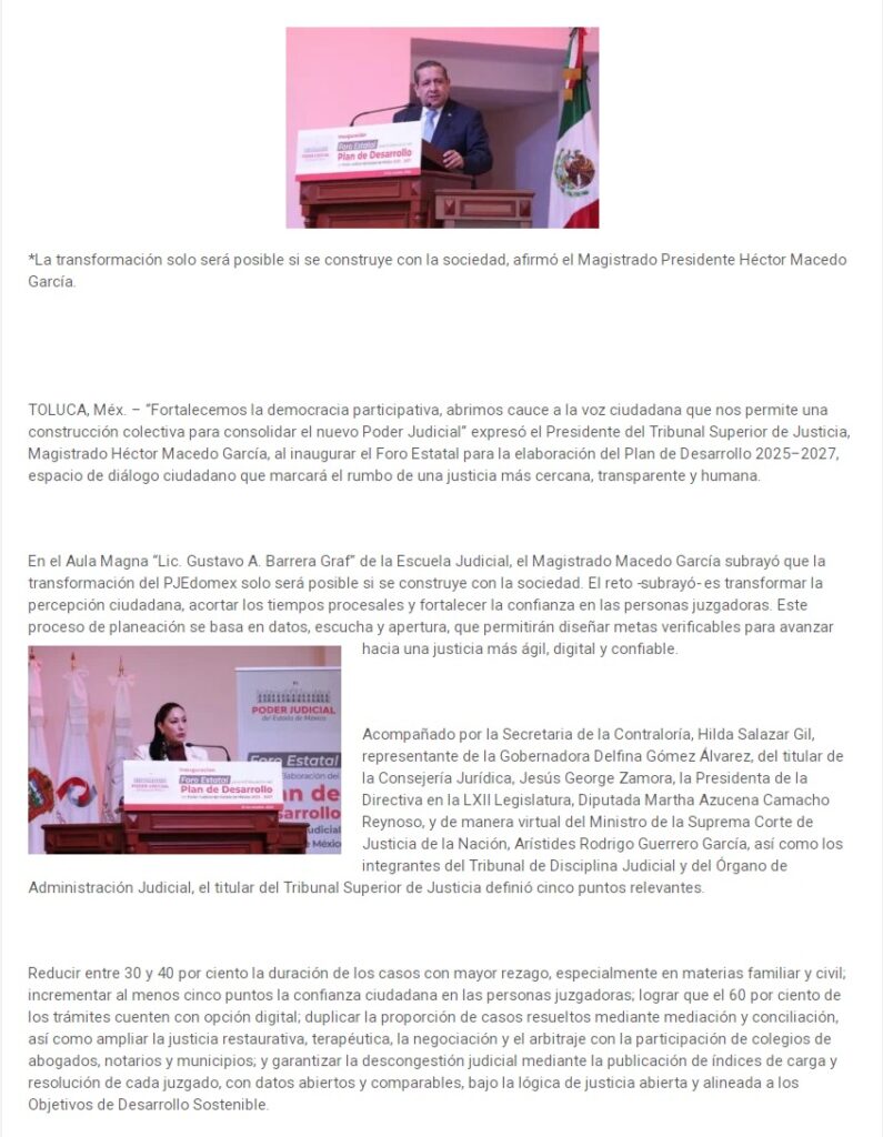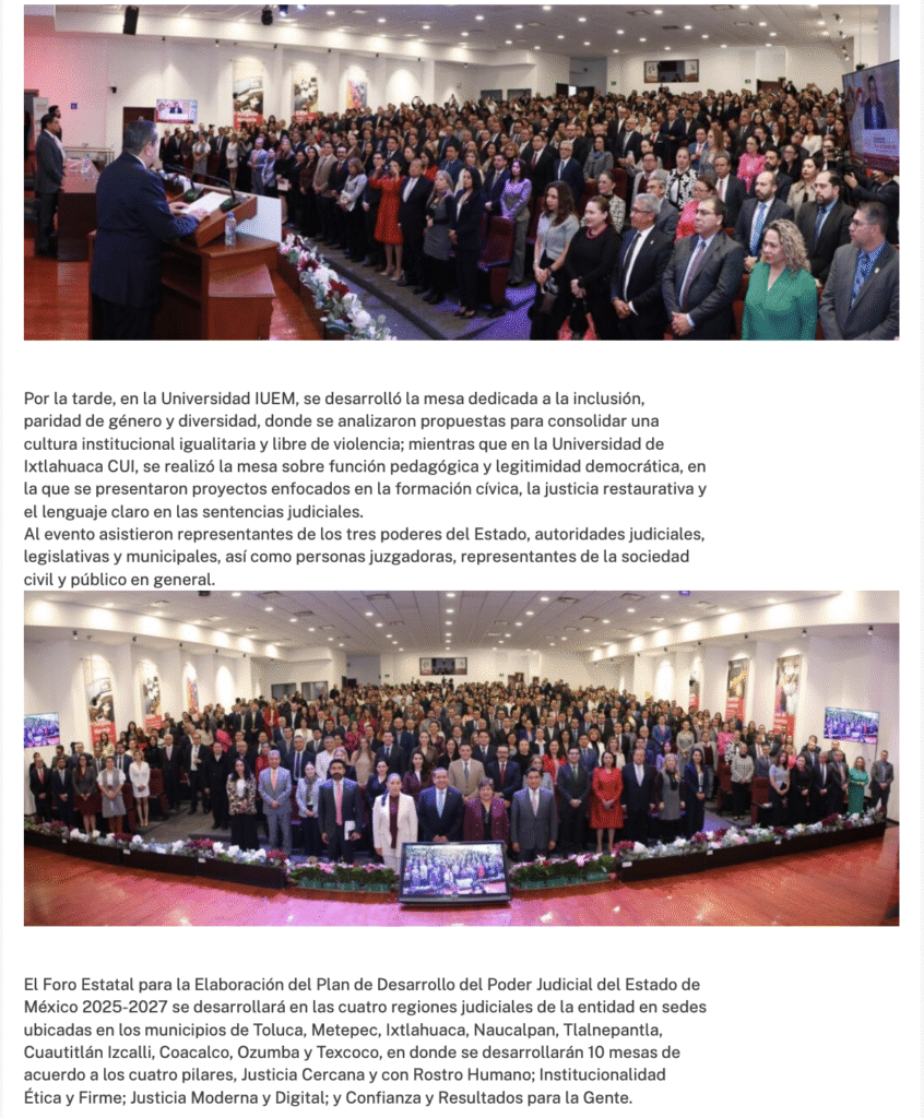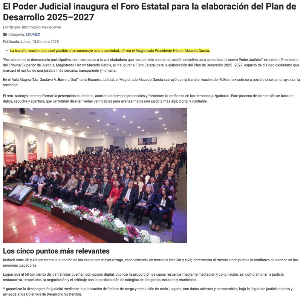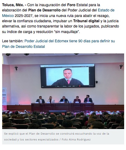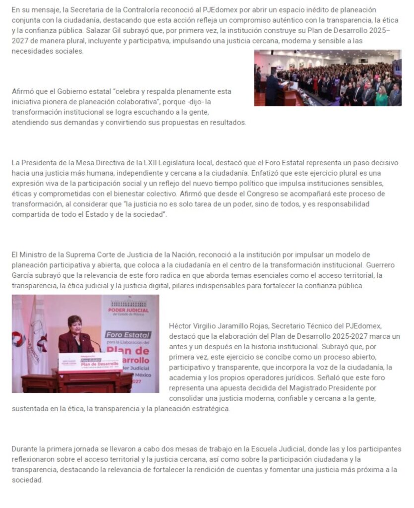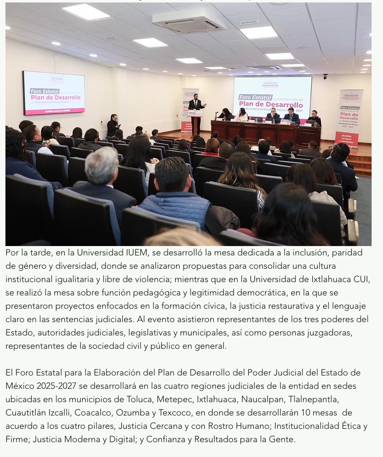 - https://informativomexiquense.com/edomex/el-poder-judicial-inaugura-el-foro-estatal-para-la-elaboracion-del-plan-de-desarrollo-2025-2027?fbclid=IwVERDUANajqxleHRuA2FlbQIxMAABHrDta6ui03siv0GTbk5FAzdBdIN0JMYsOTe7W2m7mEIP45qieBBGG0jp8e9I_aem_4nJX247uGVBq-_mUHxYZPg