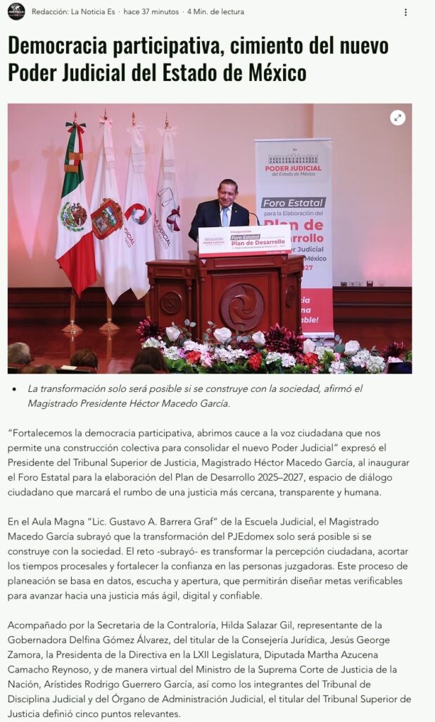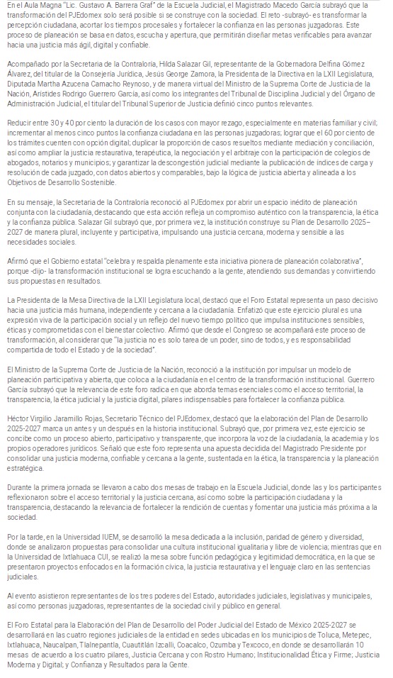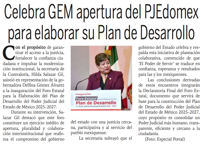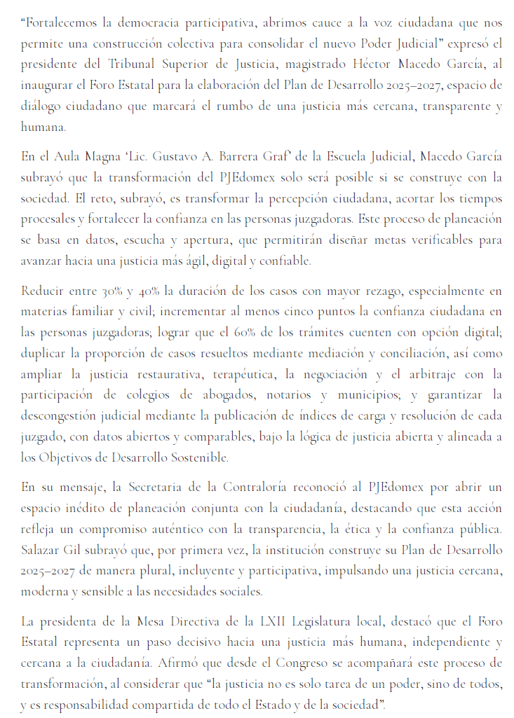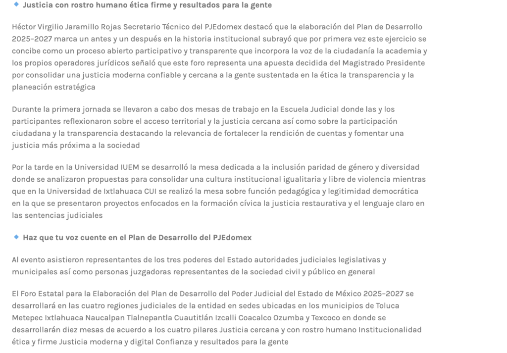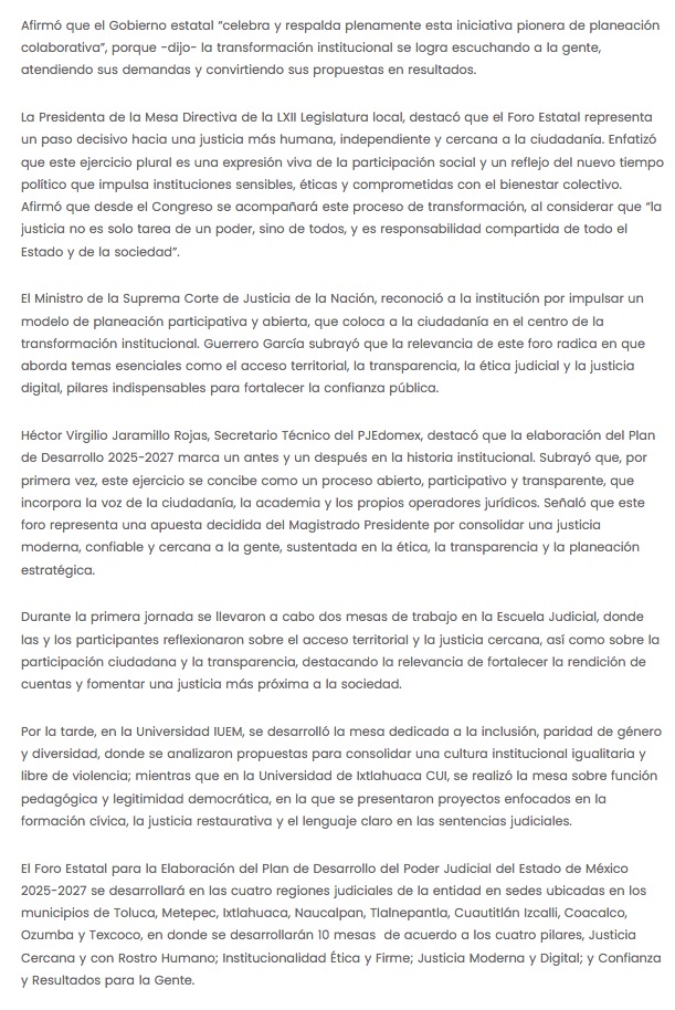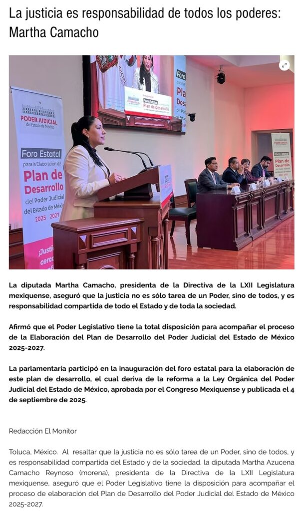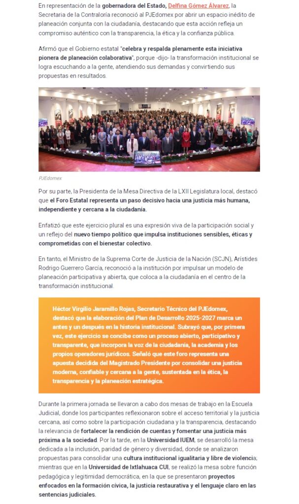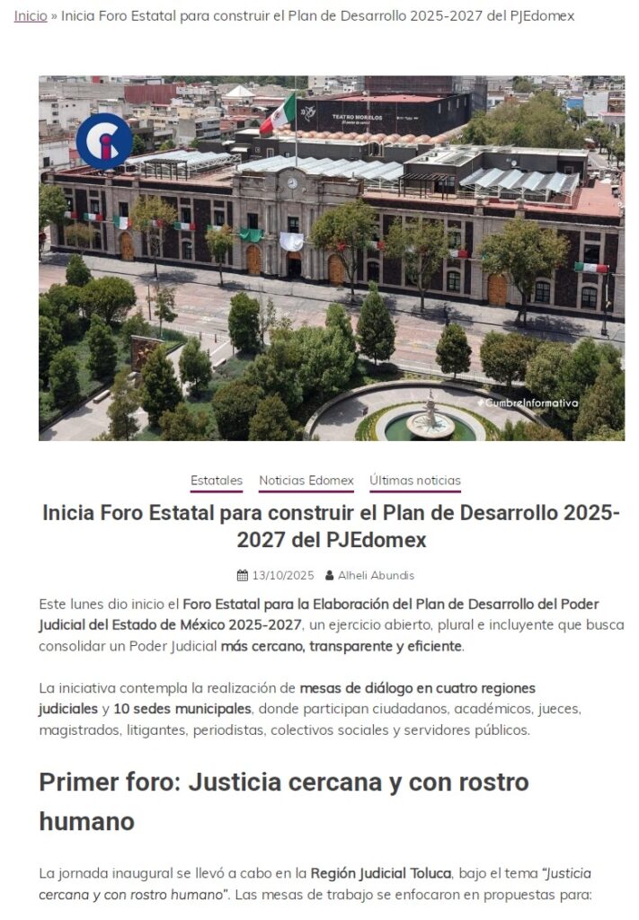 - https://informativomexiquense.com/edomex/el-poder-judicial-inaugura-el-foro-estatal-para-la-elaboracion-del-plan-de-desarrollo-2025-2027?fbclid=IwVERDUANajqxleHRuA2FlbQIxMAABHrDta6ui03siv0GTbk5FAzdBdIN0JMYsOTe7W2m7mEIP45qieBBGG0jp8e9I_aem_4nJX247uGVBq-_mUHxYZPg