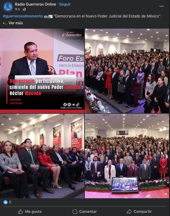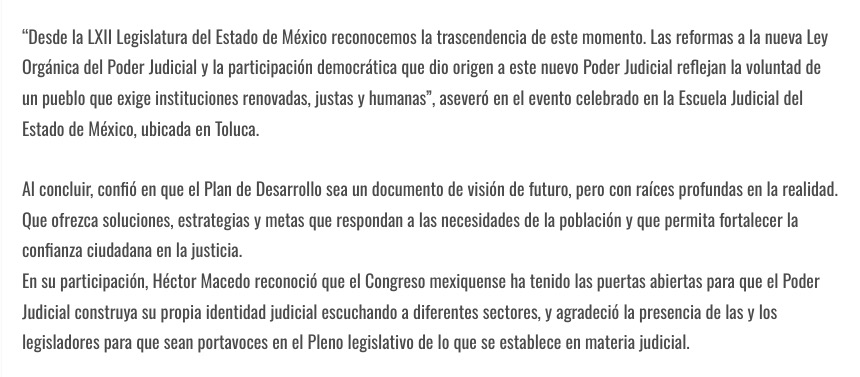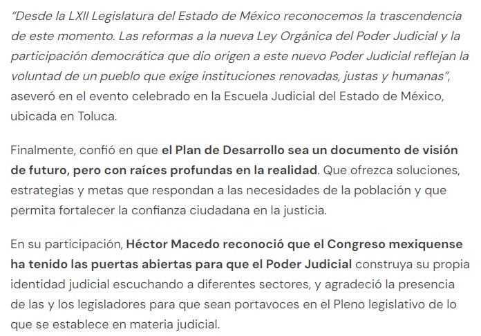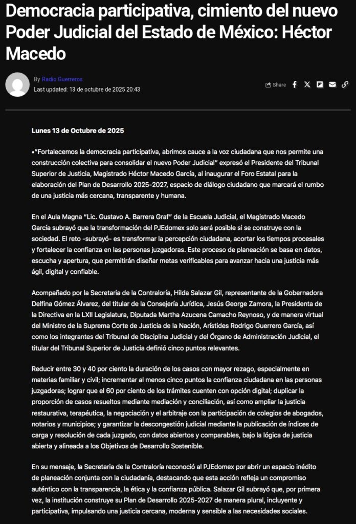 - https://radioguerrerosonline.com/index.php/2025/10/13/democracia-participativa-cimiento-del-nuevo-poder-judicial-del-estado-de-mexico-hector-macedo/?fbclid=IwY2xjawNbIO9leHRuA2FlbQIxMABicmlkETFNSnM2RFRzYzluNlN1TDVsAR6LzftbPPZu-mkMsK30Rx1doVu_qRAUXDjKhy0Jutd1QRECFo6OXM82GE6AIg_aem_pQT689N0p7hCzrlU-6qliA