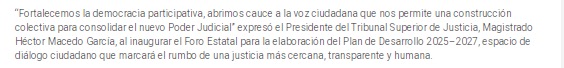 “Fortalecemos la democracia participativa, abrimos cauce a la voz ciudadana que nos permite una construcción colectiva para consolidar el nuevo Poder Judicial” expresó el Presidente del Tribunal Superior de Justicia, Magistrado Héctor Macedo García, al inaugurar el Foro Estatal para la elaboración del Plan de Desarrollo 2025-2027, espacio de diálogo ciudadano que marcará el rumbo de una justicia más cercana, transparente y humana.