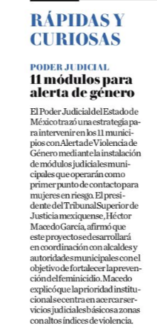 Para prevención del feminicidio, y acercar los servicios de justicia a las comunidades más vulnerables, se instalará 11 módulos judiciales municipales en las localidades que cuentan con alerta de género, dio a conocer el presidente del Poder Judicial mexiquense, Héctor Macedo García. “Estos módulos empezarán ofreciendo servicios de mediación y atención temprana”, explicó el magistrado, al señalar que esta acción forma parte de una nueva política de prevención integral impulsada desde el Poder Judicial de la entidad.