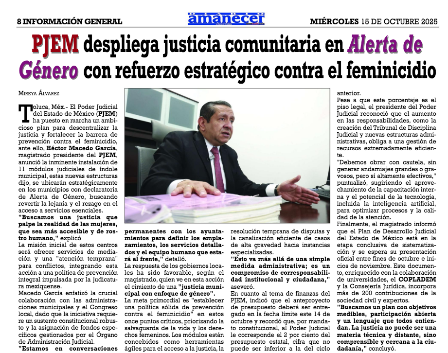 - https://diarioamanecer.com.mx/pjem-despliega-justicia-comunitaria-en-alerta-de-genero-con-refuerzo-estrategico-contra-el-feminicidio/