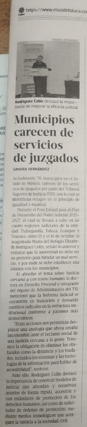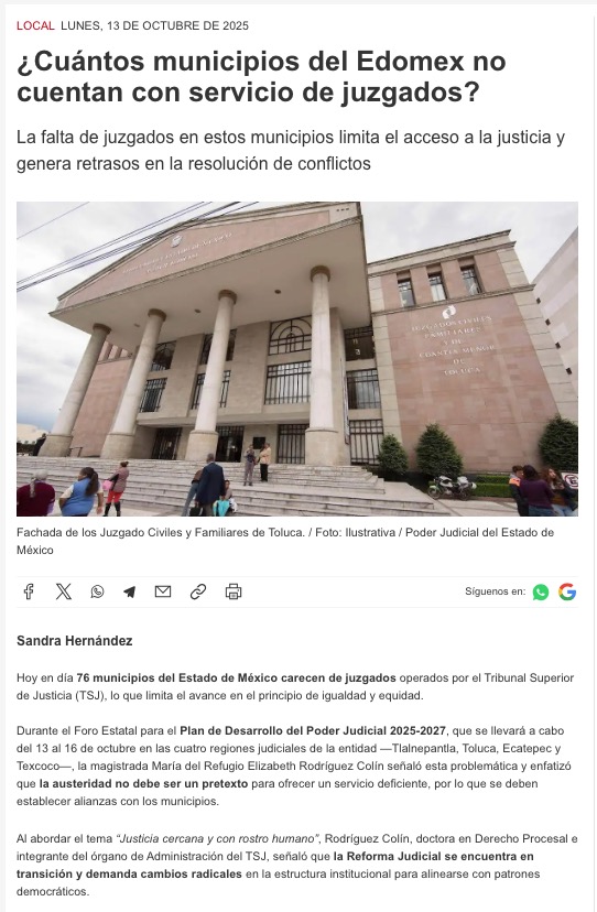 Durante el Foro Estatal para el Plan de Desarrollo del Poder Judicial 2025-2027, que se llevará a cabo del 13 al 16 de octubre en las cuatro regiones judiciales de la entidad —Tlalnepantla, Toluca, Ecatepec y Texcoco—, la magistrada María del Refugio Elizabeth Rodríguez Colín señaló esta problemática y enfatizó que la austeridad no debe ser un pretexto para ofrecer un servicio deficiente, por lo que se deben establecer alianzas con los municipios.