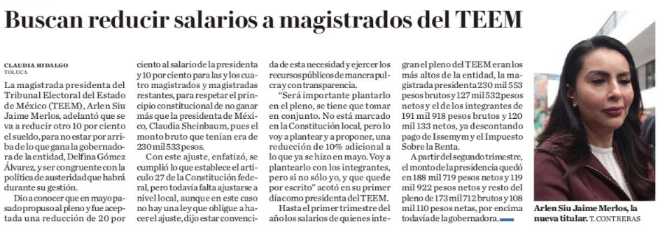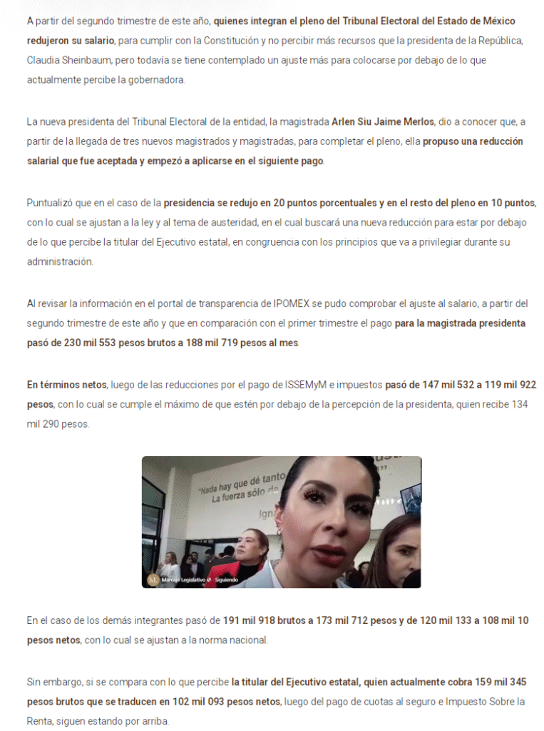 A partir del segundo trimestre de este año, quienes integran el pleno del Tribunal Electoral del Estado de México redujeron su salario, para cumplir con la Constitución y no percibir más recursos que la presidenta de la República, Claudia Sheinbaum, pero todavía se tiene contemplado un ajuste más para colocarse por debajo de lo que actualmente percibe la Gobernadora.