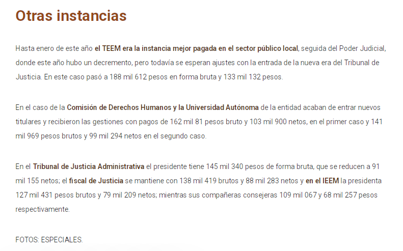 Hasta enero de este año el TEEM era la instancia mejor pagada en el sector público local, seguida del Poder Judicial, donde este año hubo un decremento, pero todavía se esperan ajustes con la entrada de la nueva era del Tribunal de Justicia. En este caso pasó a 188 mil 612 pesos en forma bruta y 133 mil 132 pesos.