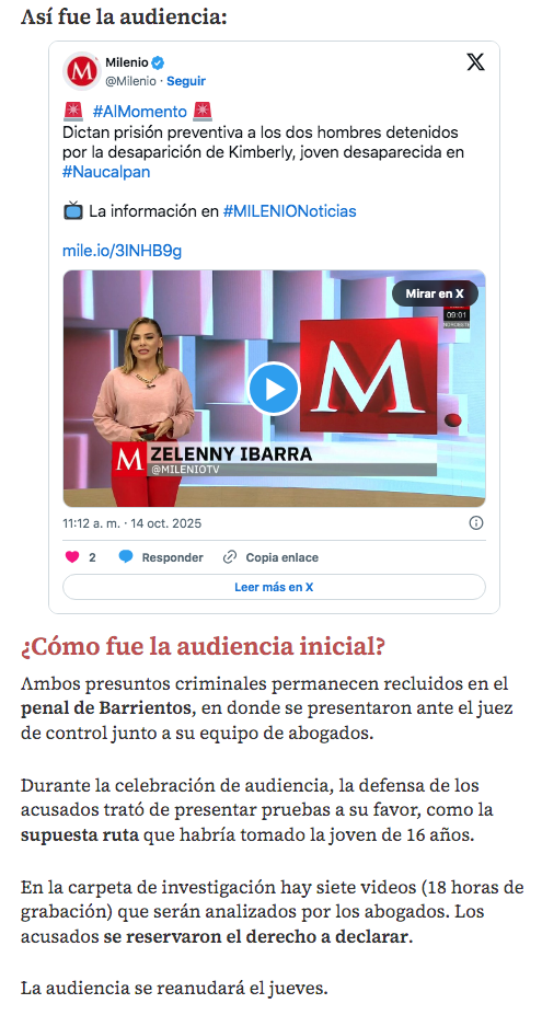 - https://www.reporteindigo.com/nacional/Caso-Kimberly-Hilary-claves-de-la-audiencia-de-los-detenidos-por-su-desaparicion-20251014-0019.html