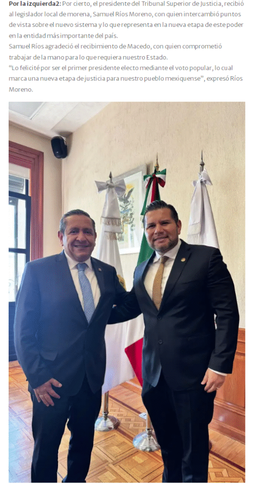 Por cierto, el presidente del Tribunal Superior de Justicia, recibió al legislador local de morena, Samuel Ríos Moreno, con quien intercambió puntos de vista sobre el nuevo sistema y lo que representa en la nueva etapa de este poder en la entidad más importante del país.