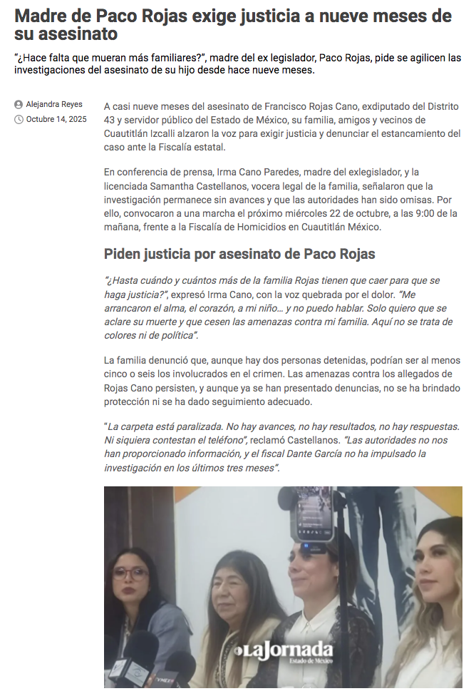 - https://lajornadaestadodemexico.com/madre-de-paco-rojas-exige-justicia-a-nueve-meses-de-su-asesinato/