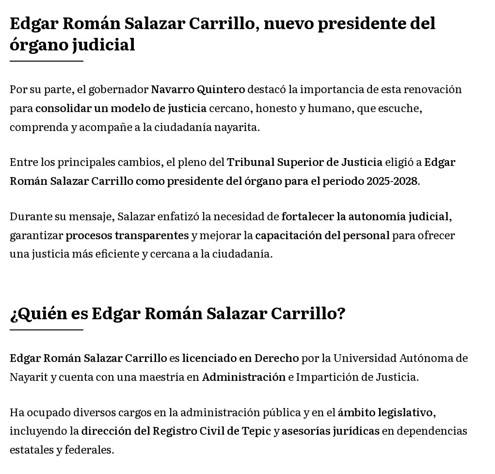 • https://heraldodemexico.com.mx/nacional/2025/10/15/edgar-roman-salazar-carrillo-sera-el-presidente-del-tribunal-superior-de-justicia-de-nayarit-737868.html