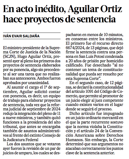 El ministro presidente de la Suprema Corte de Justicia de la Nación (SCJN), Hugo Aguilar Ortiz, presentó ayer al pleno los primeros dos proyectos de sentencia elaborados por su ponencia, algo sin precedente al ser una tarea que no realizaban sus antecesores. Ambos fueron aprobados por unanimidad.