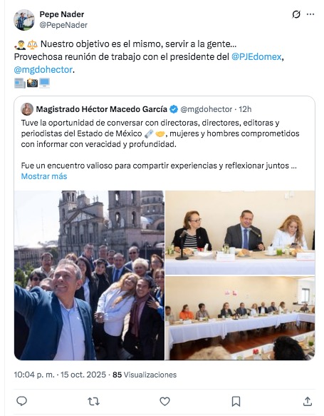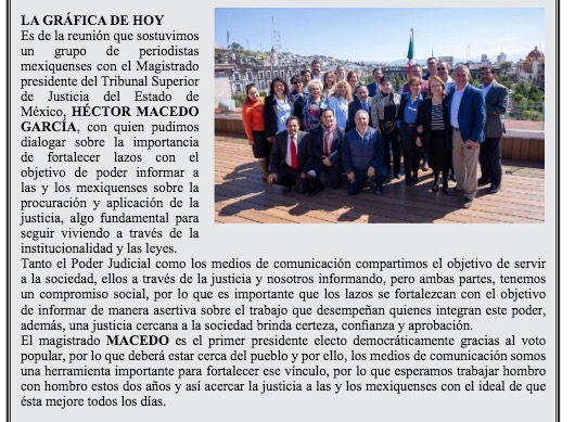 Es de la reunión que sostuvimos un grupo de periodistas mexiquenses con el Magistrado presidente del Tribunal Superior de Justicia del Estado de México, HÉCTOR MACEDO GARCÍA, con quien pudimos dialogar sobre la importancia de fortalecer lazos con el objetivo de poder informar a las y los mexiquenses sobre la procuración y aplicación de la justicia, algo fundamental para seguir viviendo a través de la institucionalidad y las leyes.