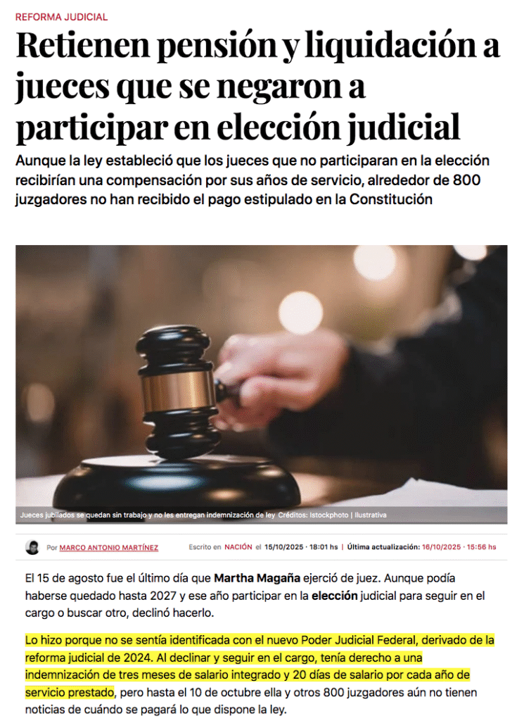 - https://lasillarota.com/nacion/2025/10/15/retienen-pension-liquidacion-jueces-que-se-negaron-participar-en-eleccion-judicial-561736.html