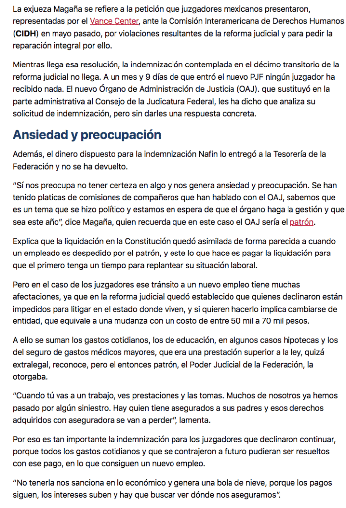 Lo hizo porque no se sentía identificada con el nuevo Poder Judicial Federal, derivado de la reforma judicial de 2024. Al declinar y seguir en el cargo, tenía derecho a una indemnización de tres meses de salario integrado y 20 días de salario por cada año de servicio prestado, pero hasta el 10 de octubre ella y otros 800 juzgadores aún no tienen noticias de cuándo se pagará lo que dispone la ley.