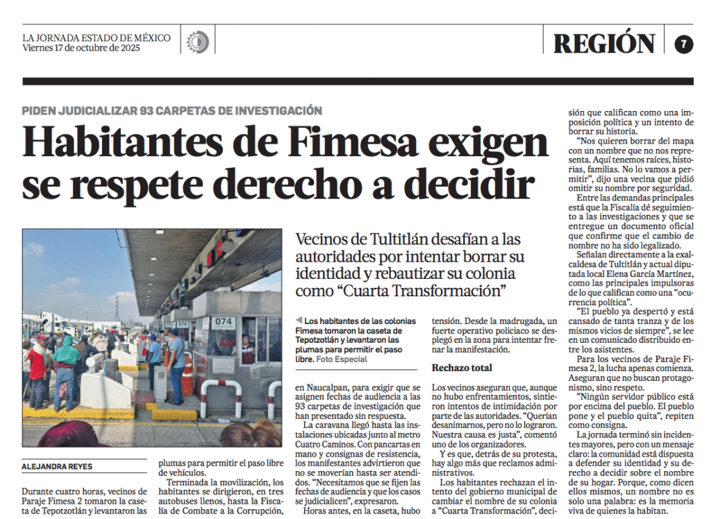 Luego de cuatro horas de tomar la caseta de Tepotzotlán y levantar las plumas para permitir el paso libre de vehículos, vecinos de Paraje Fimesa 2 se trasladaron a la Fiscalía de Combate a la Corrupción en Naucalpan, donde exigen que se les asignen fechas de audiencia para las 93 carpetas de investigación que han presentado.