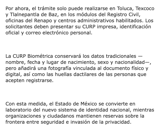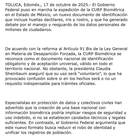 El Gobierno Federal puso en marcha la expedición de la CURP Biométrica en el Estado de México, un nuevo documento de identificación que incluye huellas dactilares, iris y rostro, y que ha generado debate por el manejo y resguardo de los datos personales de millones de ciudadanos.