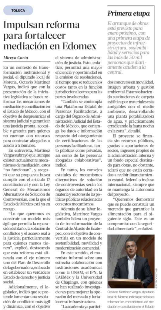 En un contexto de transformación institucional y social, el diputado local de Morena, Octavio Martínez Vargas, indicó que con la presentación de la iniciativa legislativa se busca reformar los mecanismos de mediación y conciliación en el Estado de México, con el objetivo de despresurizar el sistema judicial y garantizar una justicia pronta, accesible y gratuita para quienes no cuentan con recursos para contratar abogados o acudir a tribunales.