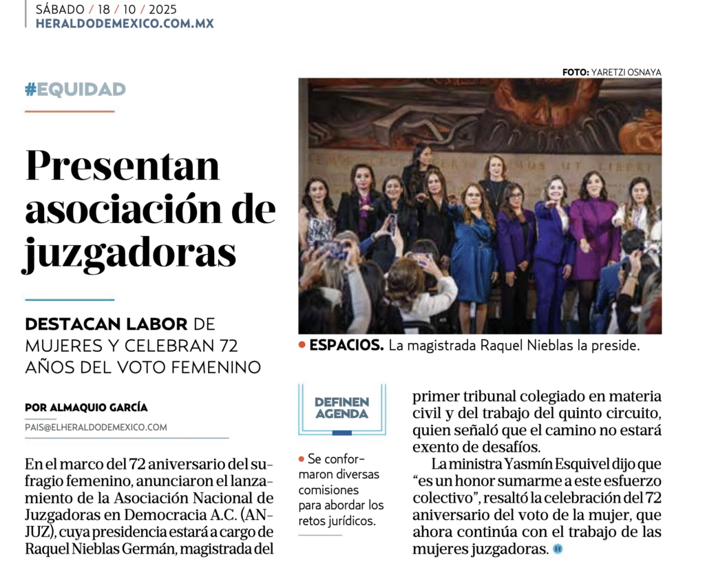 En el marco del 72 aniversario del sufragio femenino, anunciaron el lanzamiento de la Asociación Nacional de Juzgadoras en Democracia A.C. (AN- JUZ), cuya presidencia estará a cargo de Raquel Nieblas Germán, magistrada del primer tribunal colegiado en materia civil y del trabajo del quinto circuito, quien señaló que el camino no estará exento de desafíos.