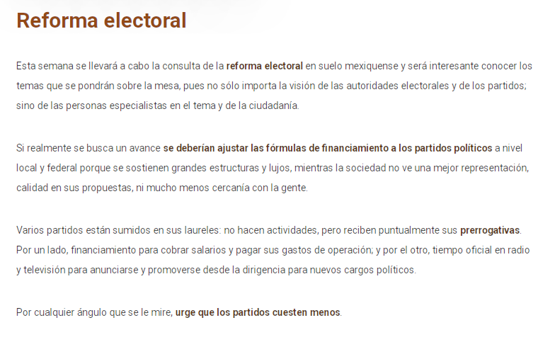 Esta semana se llevará a cabo la consulta de la reforma electoral en suelo mexiquense y será interesante conocer los temas que se pondrán sobre la mesa, pues no sólo importa la visión de las autoridades electorales y de los partidos; si no de las personas especialistas en el tema y de la ciudadanía.