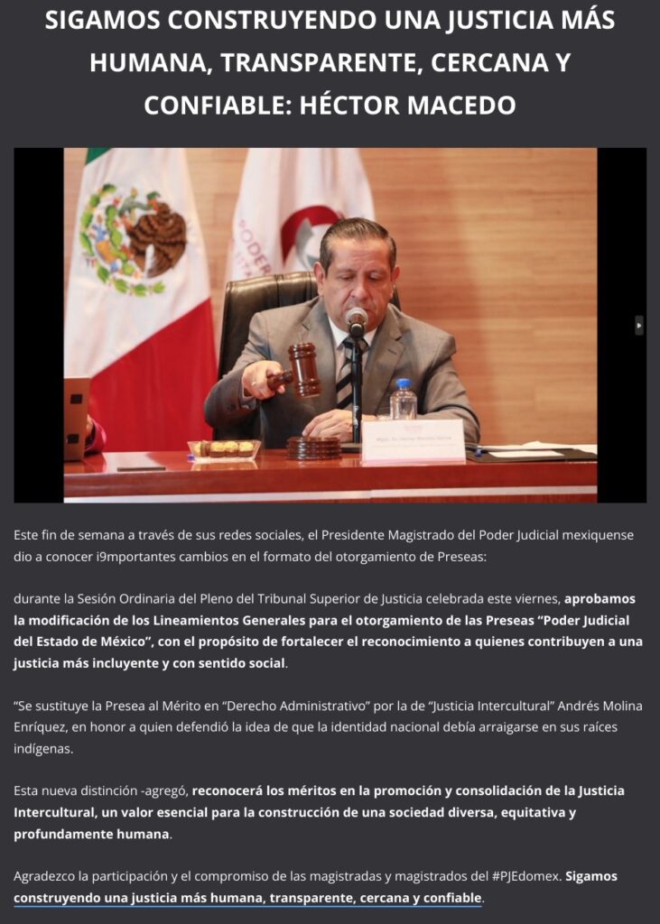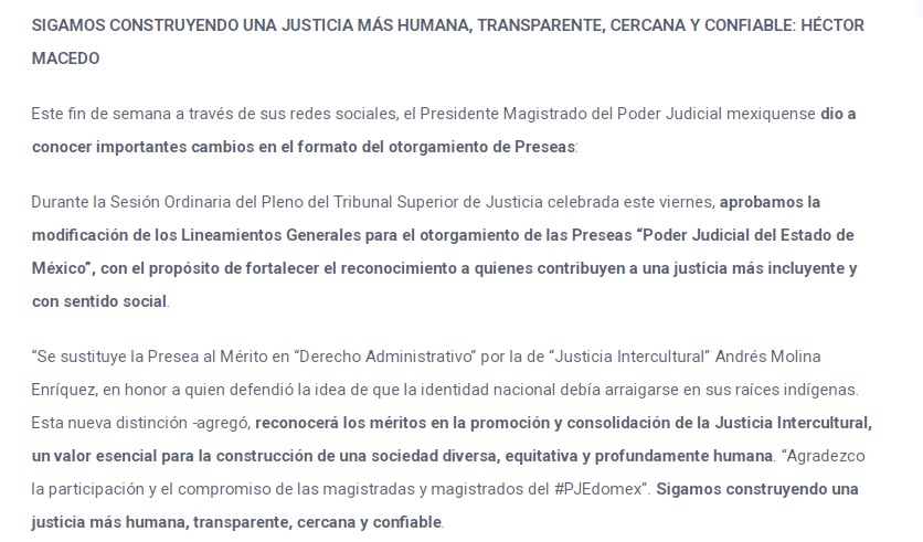 Este fin de semana a través de sus redes sociales, el Presidente Magistrado del Poder Judicial mexiquense dio a conocer i9mportantes cambios en el formato del otorgamiento de Preseas: