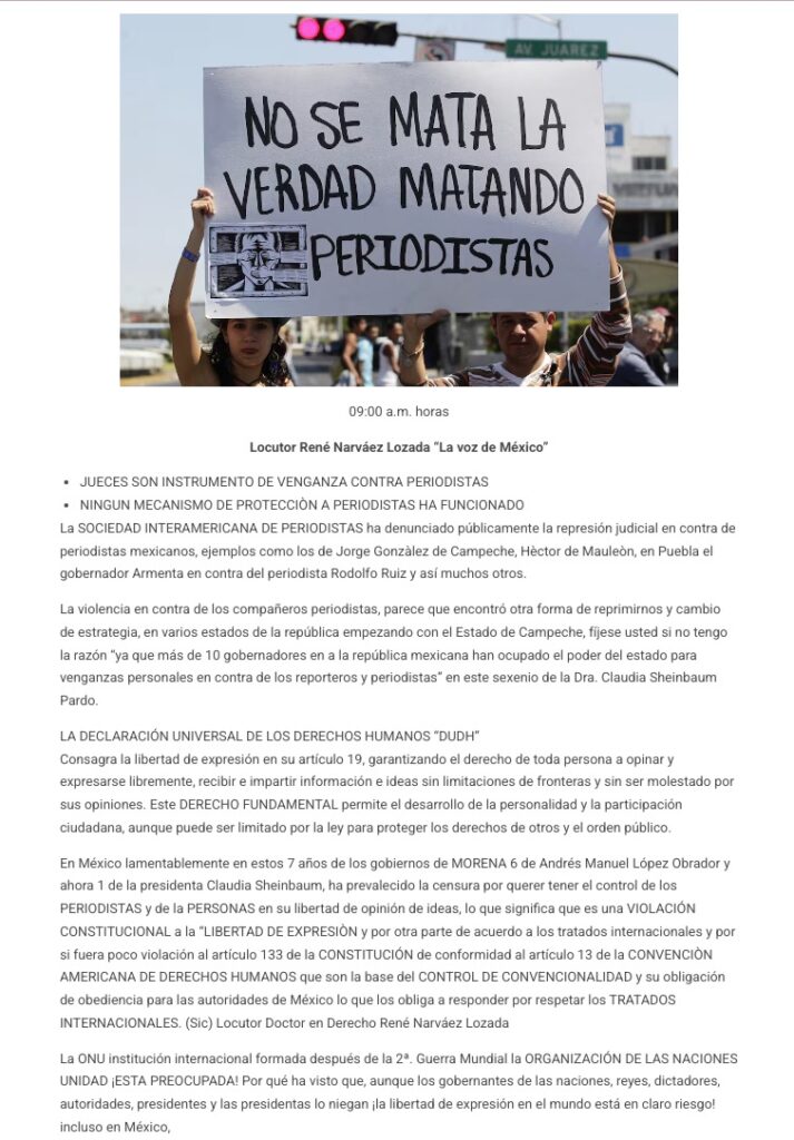 La SOCIEDAD INTERAMERICANA DE PERIODISTAS ha denunciado públicamente la represión judicial en contra de periodistas mexicanos, ejemplos como los de Jorge Gonzàlez de Campeche, Hèctor de Mauleòn, en Puebla el gobernador Armenta en contra del periodista Rodolfo Ruiz y así muchos otros.