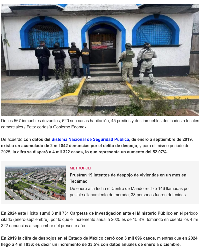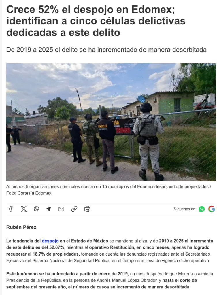La tendencia del despojo en el Estado de México se mantiene al alza, y de 2019 a 2025 el incremento de este delito es del 52.07%, mientras el operativo Restitución, en cinco meses, apenas ha logrado recuperar el 18.7% de propiedades, tomando en cuenta las denuncias registradas ante el Secretariado Ejecutivo del Sistema Nacional de Seguridad Pública, en el tiempo que lleva de vigencia dicho operativo.