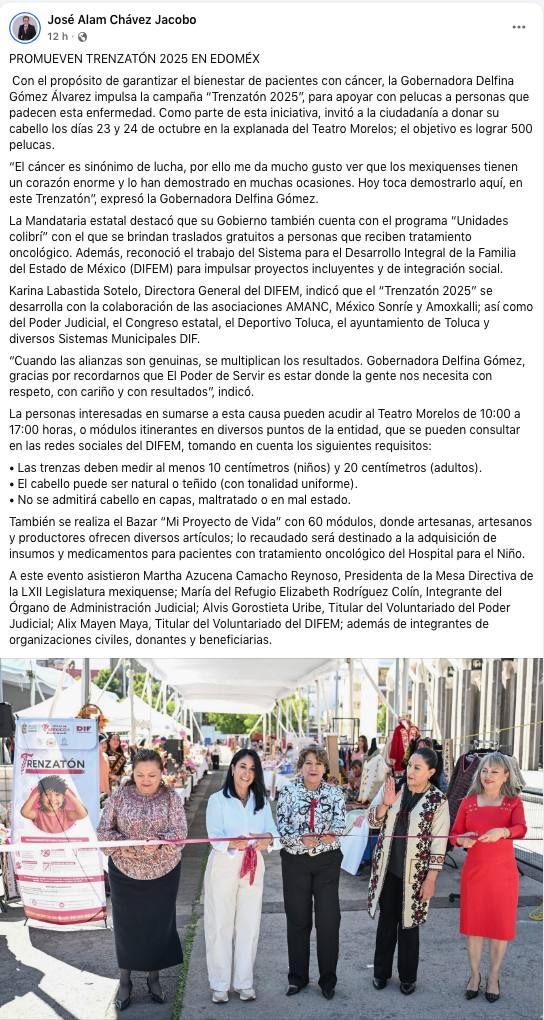 Con el propósito de garantizar el bienestar de pacientes con cáncer, la Gobernadora Delfina Gómez Álvarez impulsa la campaña “Trenzatón 2025”, para apoyar con pelucas a personas que padecen esta enfermedad. Como parte de esta iniciativa, invitó a la ciudadanía a donar su cabello los días 23 y 24 de octubre en la explanada del Teatro Morelos; el objetivo es lograr 500 pelucas.