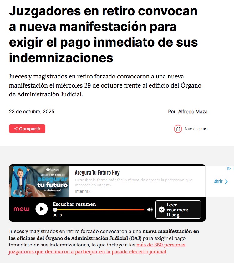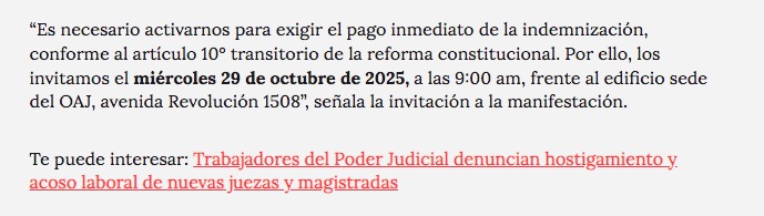 Jueces y magistrados en retiro forzado convocaron a una nueva manifestación el miércoles 29 de octubre frente al edificio del Órgano de Administración Judicial para exigir el pago inmediato de sus indemnizaciones, lo que incluye a las màs de 850 personas juzgadores que declinaron a participar en la pasada elección judicial.