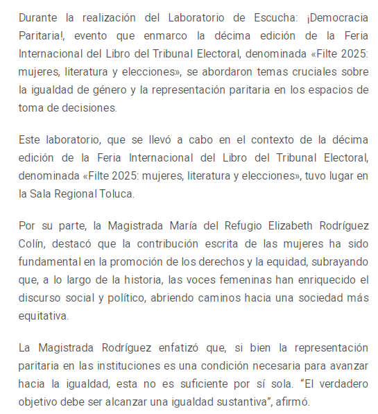 Durante la realización del Laboratorio de Escucha: ¡Democracia Paritaria!, evento que enmarco la décima edición de la Feria Internacional del Libro del Tribunal Electoral, denominada «Filte 2025: mujeres, literatura y elecciones», se abordaron temas cruciales sobre la igualdad de género y la representación paritaria en los espacios de toma de decisiones.