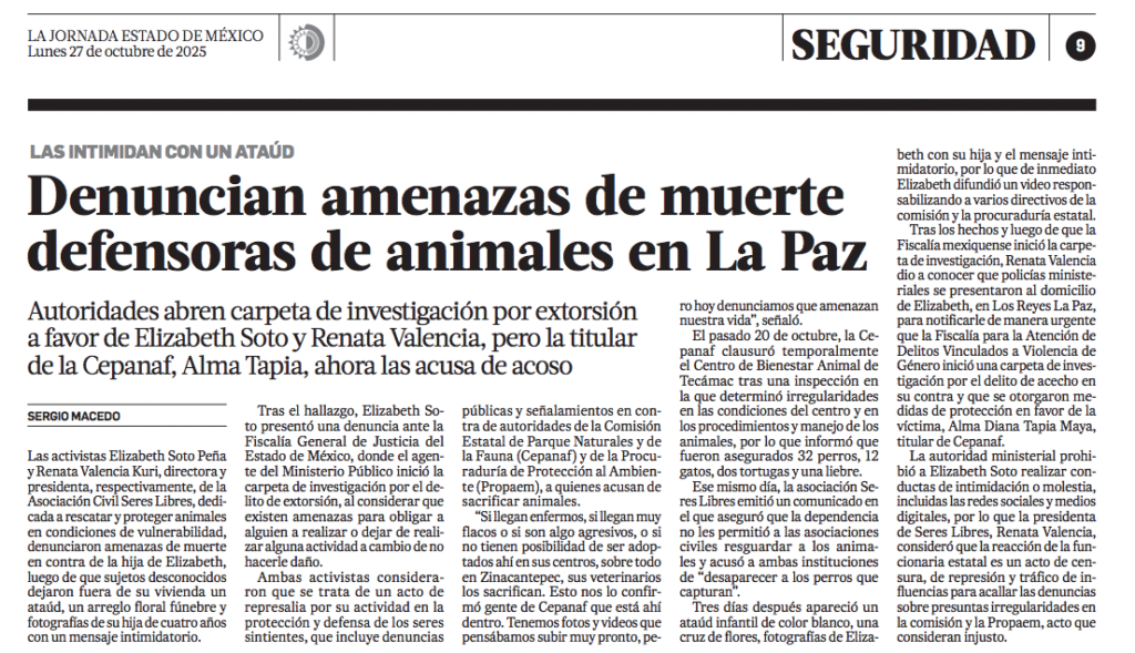 - https://lajornadaestadodemexico.com/protectora-de-animales-seres-libres-denuncian-amenazas-de-muerte/