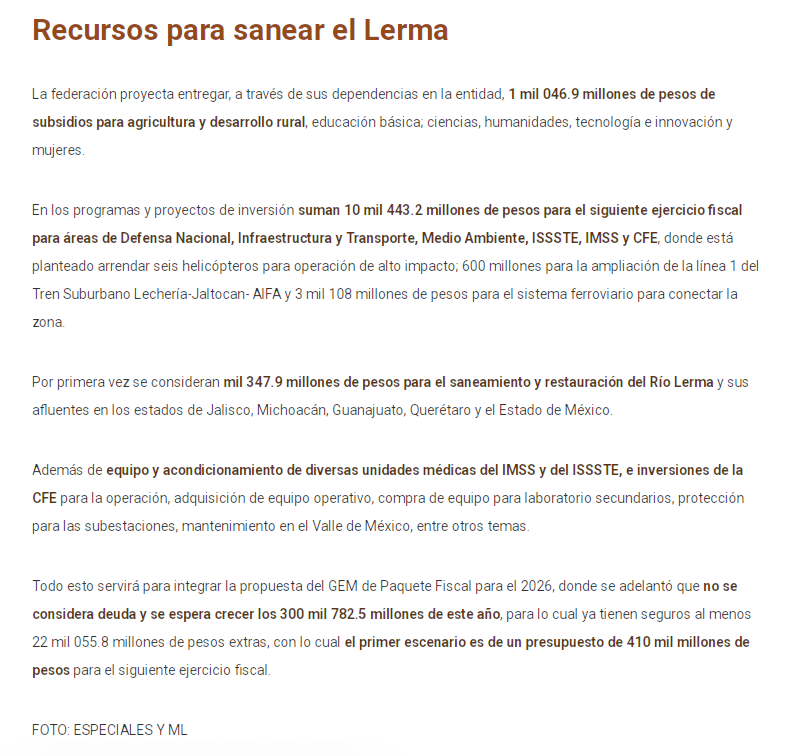 En el presupuesto del 2026 para el Estado de México no se contemplan recursos federales para el Fondo de Seguridad ni para infraestructura educativa, pero por primera vez el gobierno federal invertirá directamente mil 347.9 millones de pesos en el saneamiento y recuperación del Río Lerma y sus afluentes.