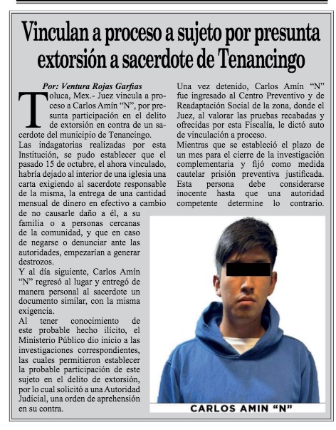 Juez vincula a proceso a Carlos Amín “N”, por presunta participación en el delito de extorsión en contra de un sacerdote del municipio de Tenancingo.