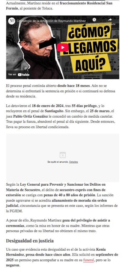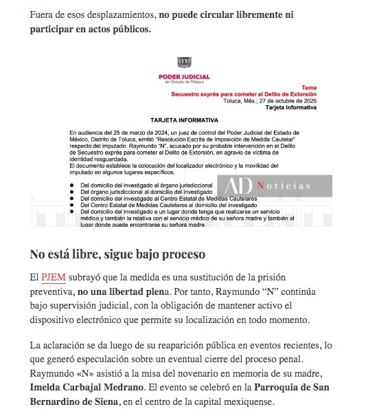 La aclaración se da luego de su reaparición pública en eventos recientes, lo que generó especulación sobre un eventual cierre del proceso penal. Raymundo «N» asistió a la misa del novenario en memoria de su madre, Imelda Carbajal Medrano. El evento se celebró en la Parroquia de San Bernardino de Siena, en el centro de la capital mexiquense.