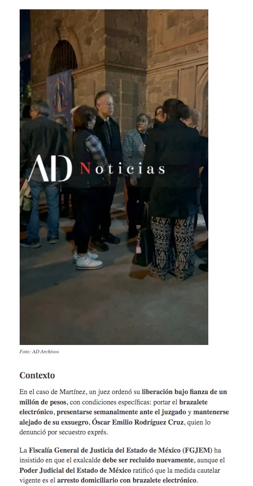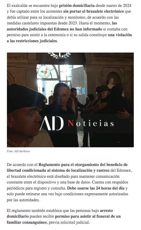 De acuerdo con una tarjeta informativa, la medida cautelar fue impuesta por un juez de control del Distrito Judicial de Toluca durante la audiencia celebrada el 25 de marzo de 2024 y continúa vigente. El documento establece que el exfuncionario debe portar un localizador electrónico y restringir su movilidad a espacios previamente autorizados: