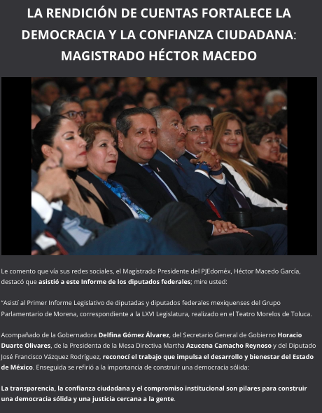 Le comento que vía sus redes sociales, el Magistrado Presidente del PJEdoméx, Héctor Macedo García, destacó que asistió a este Informe de los diputados federales; mire usted: