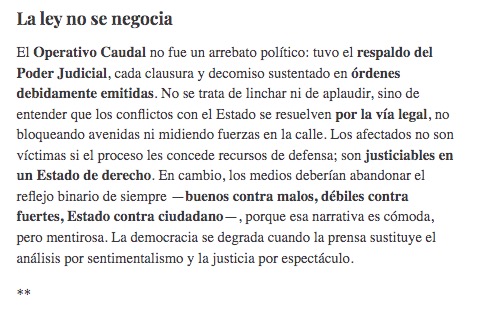 El Operativo Caudal no fue un arrebato político: tuvo el respaldo del Poder Judicial, cada clausura y decomiso sustentado en órdenes debidamente emitidas. No se trata de linchar ni de aplaudir, sino de entender que los conflictos con el Estado se resuelven por la vía legal, no bloqueando avenidas ni midiendo fuerzas en la calle. Los afectados no son víctimas si el proceso les concede recursos de defensa; son justiciables en un Estado de derecho. En cambio, los medios deberían abandonar el reflejo binario de siempre —buenos contra malos, débiles contra fuertes, Estado contra ciudadano—, porque esa narrativa es cómoda, pero mentirosa. La democracia se degrada cuando la prensa sustituye el análisis por sentimentalismo y la justicia por espectáculo.