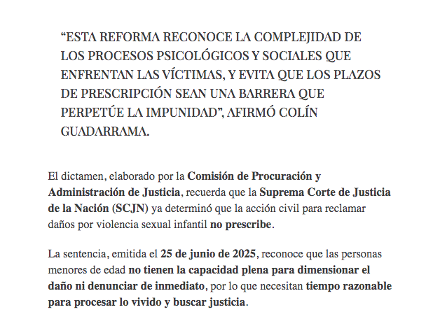 El Congreso del Estado de México aprobó que la reparación del daño por abuso o violencia sexual contra niñas, niños y adolescentes sea imprescriptible, es decir, que no haya límite de tiempo para exigir justicia.