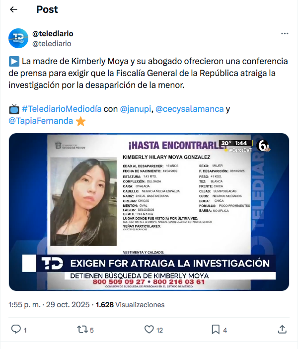 - https://oem.com.mx/la-prensa/policiaca/la-busqueda-de-kimberly-hillary-no-se-detiene-madre-exige-resultados-a-la-fgjem-26561700?fbclid=IwY2xjawNxp3JleHRuA2FlbQIxMQABHtA3nBpERSYGXO488bIOvIXX6x38g9qkJI_k3c2ljqEQxtwUu7K1pAoneKTg_aem__ZDUib58rVR5LxuFkMRczw