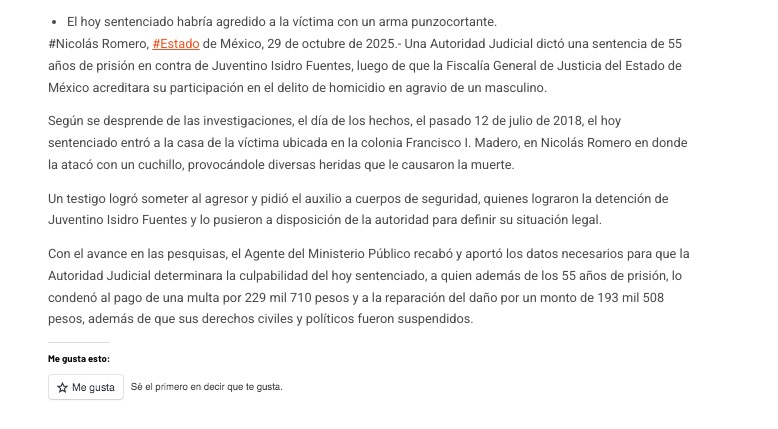 • https://reporterosenmovimiento.com/2025/10/29/por-homicidio-sucedido-en-nicolas-romero-sujeto-fue-sentenciado-a-55-anos-de-prision/?utm_source=facebook&utm_medium=jetpack_social&fbclid=IwY2xjawNwZTNleHRuA2FlbQIxMQABHvlJfKQqUKjTv8G0_69W8X17WiEsKgs8LqUIeXNOQO3Braqc4fS5YA8HiV5L_aem_wMe4wQmtHlbNe_PbMG2M-Q