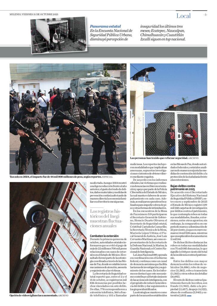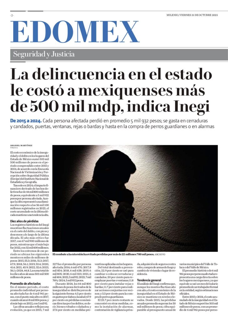 La delincuencia en el estado le costó a mexiquenses más de 500 mil mdp, indica Inegi